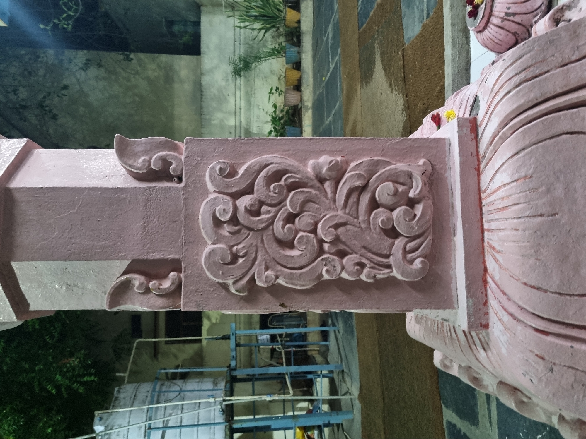close-up of a pink, ornamented structure. The structure features detailed relief carvings. The immediate environment includes other architectural elements of the same pink material, suggesting it is part of a larger building or temple. In the background, there is a glimpse of other buildings, plants, and infrastructure, suggesting an urban or suburban environment. Based on the location, the structure is likely located in the city of Pedda Kammavaripalli, India.