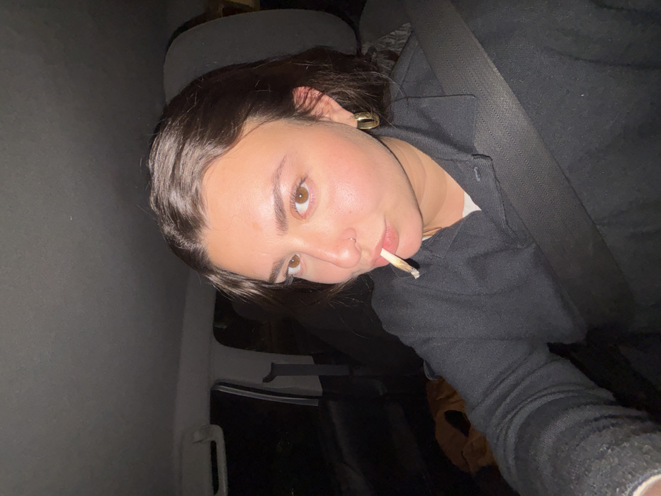 A young woman with dark hair and brown eyes is captured in a close-up, angled shot. She is wearing a black shirt and a seatbelt, suggesting she's in a car. She has a cigarette in her mouth. Her expression is direct and slightly defiant. She has a nose ring. The background is dimly lit, with a car window. Her skin is fair. She wears a gold earring.
