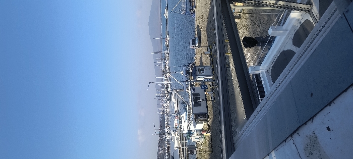 The image displays the marina in Sozopol, Bulgaria, viewed from an elevated vantage point on a clear, sunny day. The foreground features a grey paved surface, likely a walkway or balcony, bordered by a white railing with decorative arch cutouts underneath. On the far right, a dark vertical metallic structure is partially visible, with a spherical black object attached. The midground reveals a graveled shoreline area adjacent to the water. Multiple small structures are present: a white rectangular building, a smaller white booth with a blue roof, and another larger white building. Various light poles and utility posts are scattered throughout, one featuring a blue "P" parking sign. A white panel van is parked on the right side of this area near the water. The bay's calm, dark blue water is densely populated with numerous white-hulled boats, primarily sailboats with visible masts and several motor yachts. In the background, low-lying mountains or hills are visible across the expanse of the bay, situated beneath a uniformly bright blue sky. No individuals are discernible within the frame.