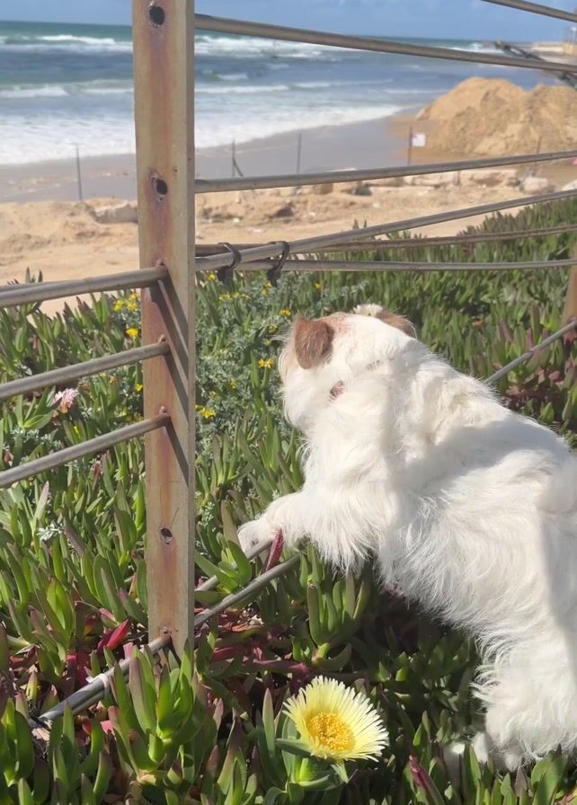 A white dog with brown markings is standing amidst green succulent ground cover, peering through a rusted metal fence at the beach and ocean. A pile of sand sits behind a white fence on the beach. A few yellow flowers dot the ground cover. The ocean is visible in the background with waves rolling in on a bright, sunny day.