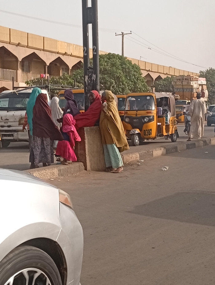 A group of women wearing hijabs stand beside a pole on a city street. They are near a curb and waiting, possibly for transportation. A silver car is visible in the foreground. Yellow auto rickshaws, also known as "keke napep" in Nigeria, are parked behind them. A line of buildings with arched windows stands in the background. A man in traditional attire is further down the sidewalk. The scene depicts a busy roadside in an urban area.