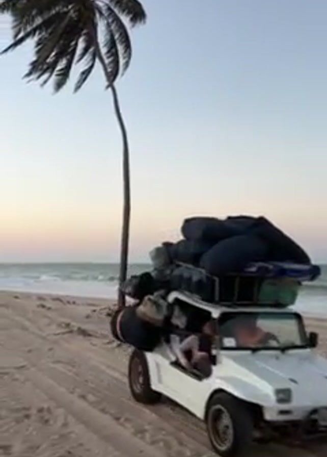 A white, open-top vehicle loaded with luggage is driving on a sandy beach