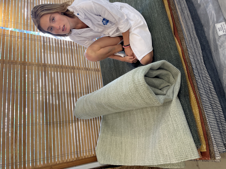 A person kneels beside a rolled light green rug and a stack of various colored rugs