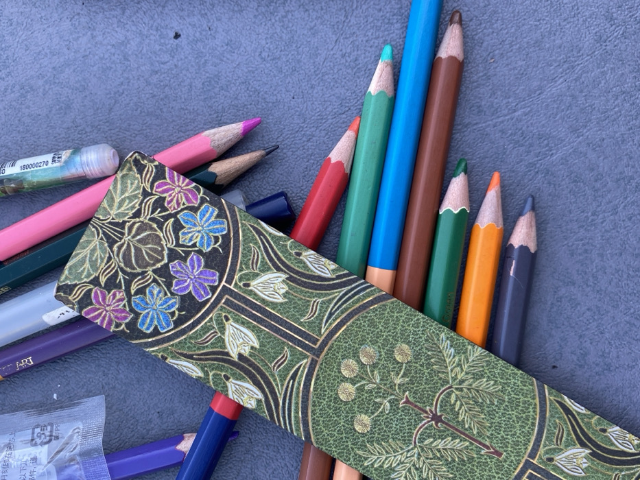 The image displays a collection of stationery items arranged on a textured, dull grey-blue surface, likely in Pai, Thailand. Dominating the center-left is an elongated, rectangular object, possibly a decorative bookmark or journal cover, featuring intricate patterns. Its upper section is dark green with gold outlines framing blue, purple, and pink glittered flowers with golden leaves. The lower section transitions to a lighter green, textured background with gold-outlined foliage and white bell-shaped flowers, and further down, a gold-outlined branch with round seed-like clusters. Scattered around and partially beneath this central item are numerous colored pencils in various hues, including purple, pink, dark green, red, light green, blue, brown, orange, and dark blue/grey. Most pencils appear sharpened, revealing their wooden casings. Other writing or crafting tools are also present: a white-capped marker or pen with a visible label showing "18000270" in the upper right, a dark blue pen or marker with a cap, and a small, transparent plastic bag containing small, possibly purple, items (such as erasers or lead refills) with Japanese text visible on its surface in the upper left quadrant. No individuals are present in the scene, and no specific actions or interactions are depicted beyond the static arrangement of objects.