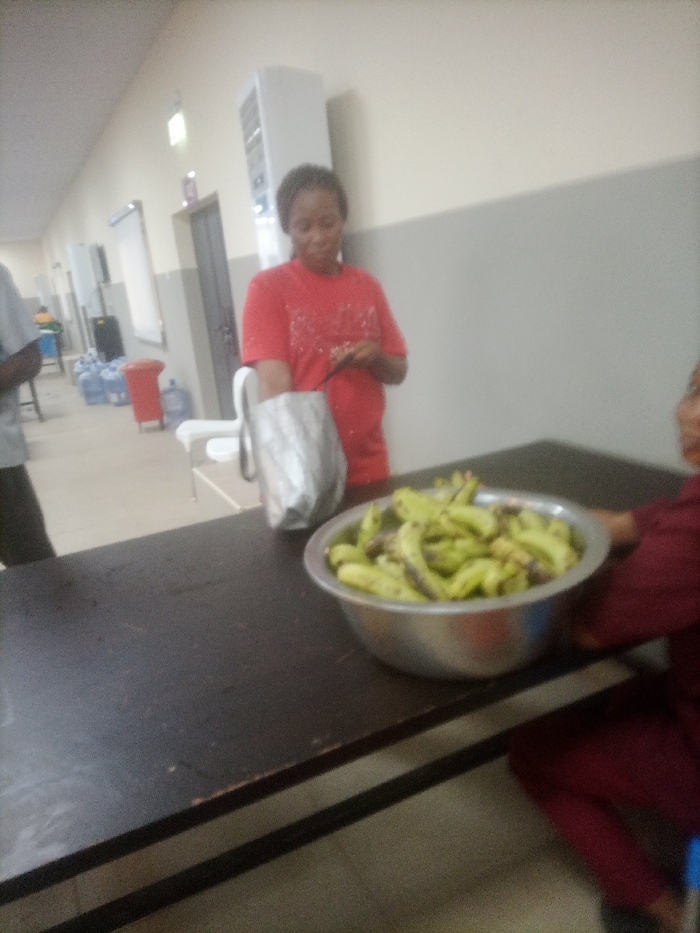 A woman in a red shirt stands behind a dark table with a large metal bowl filled with green bananas. She is holding a silver bag. A second person wearing a red shirt is seated on the right side of the frame. Bottles of water line the hallway visible behind the first woman. A red trash can and an air conditioner are also visible in the background.