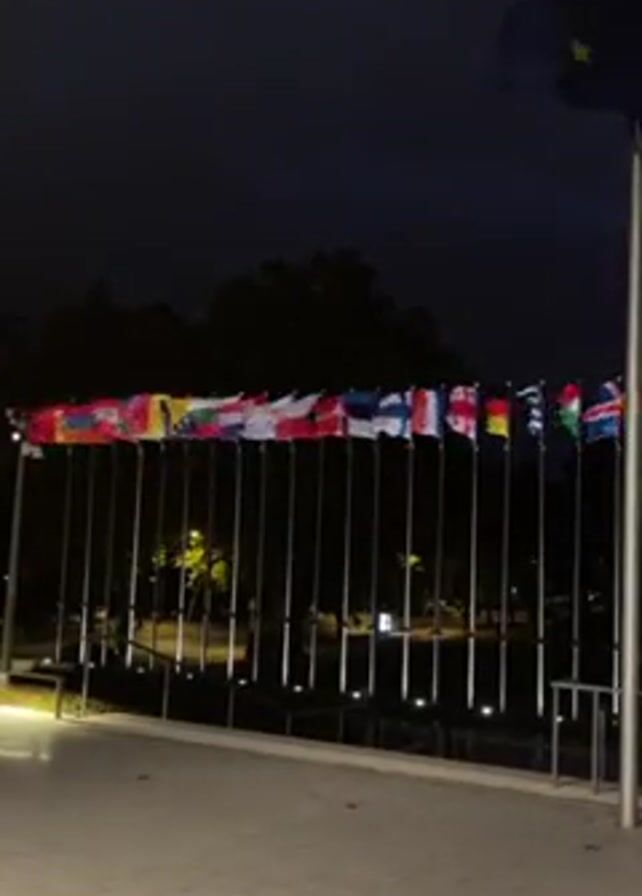 row of national flags, possibly European Union member states, fluttering in the wind at night. The flags are attached to individual flagpoles. In the foreground, there is a paved area and a low fence. Behind the flags, there is a park or garden area with some lighting. The European Union flag is visible in the upper right corner of the frame. The sky is dark. The video appears to be stationary.