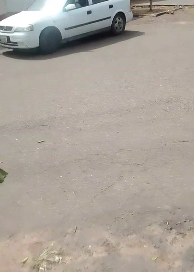stationary white Opel Astra station wagon parked on an asphalt road next to a building. The car is facing to the right of the frame, with its driver's side visible. The front left tire appears to be flat. The road has some cracks and patches, and there is some debris and foliage on the edges. The building is a light color with a red roof or trim. The weather appears to be sunny, and the video is shot from a low angle.