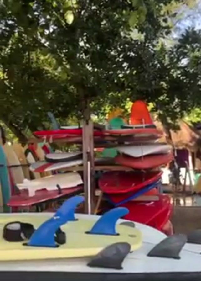 The scene is set outdoors at a beachside surfboard rental shop or area