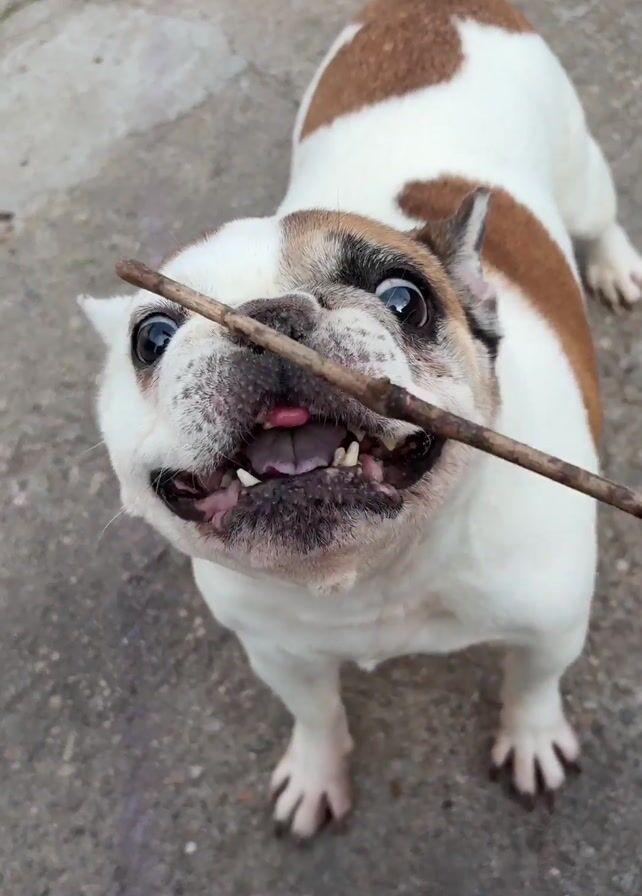 A person holds a small, thin twig in front of a white and brown French Bulldog. The dog looks up at the twig, then opens its mouth wide and takes the twig in its mouth. The dog’s teeth are visible. The dog is standing on a grey concrete surface.