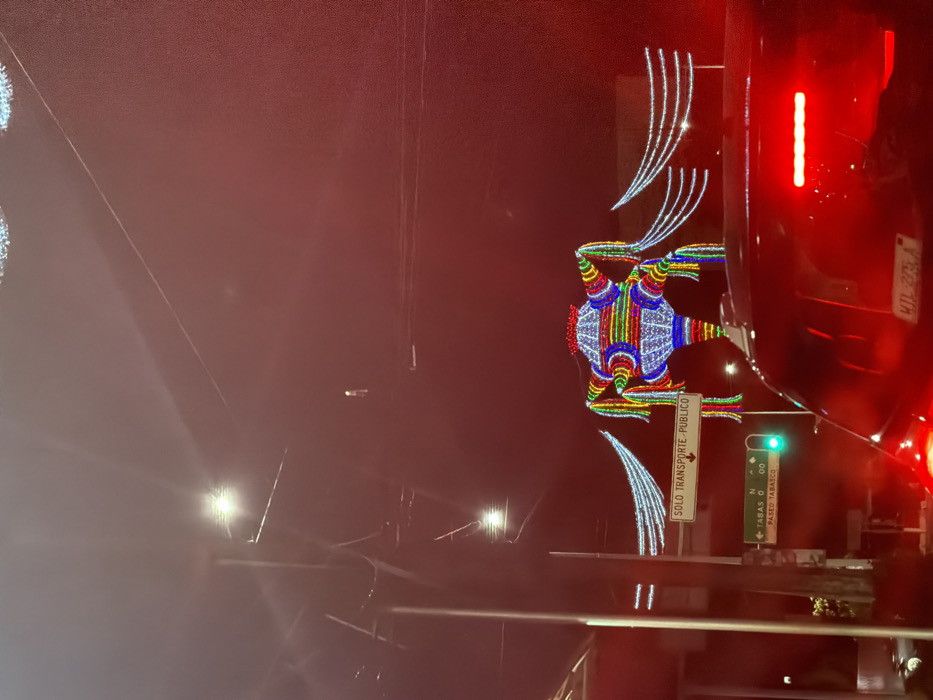 A sideways image shows a night scene featuring a vibrant, colorful, illuminated frog decoration adorning a street pole. The frog has multiple arms and legs with what appear to be comets above and below it. The scene includes street signs and lights. To the right of the frog is a vehicle and what looks like its tail lights. The image is a little blurry and the frog and vehicle are the prominent subjects.