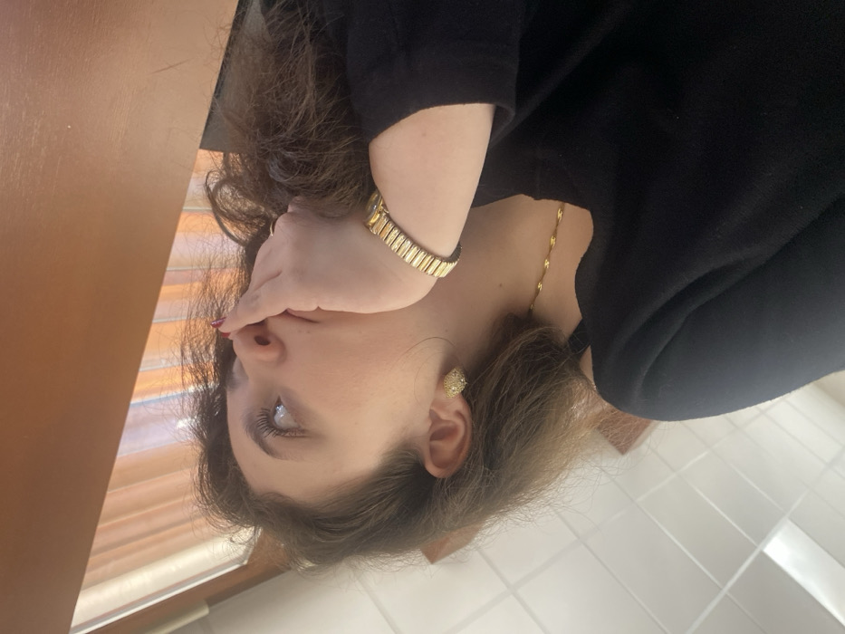 The image depicts a young female, situated indoors in Schiltigheim, France. She has brown, curly hair and is wearing a black long-sleeved top, a gold-colored watch on her left wrist, a gold-colored chain necklace, and a gold-colored, possibly gemstone-studded, stud earring in her left ear. Her left index finger, adorned with red nail polish, is positioned over her upper lip and nose. She is looking upwards and slightly to the left from the viewer's perspective, with her head tilted. The background includes a brown, wooden surface in the upper right, an orange and brown striped pattern, likely a curtain or blinds, and a white tiled wall on the left. The scene is illuminated, suggesting an indoor environment.