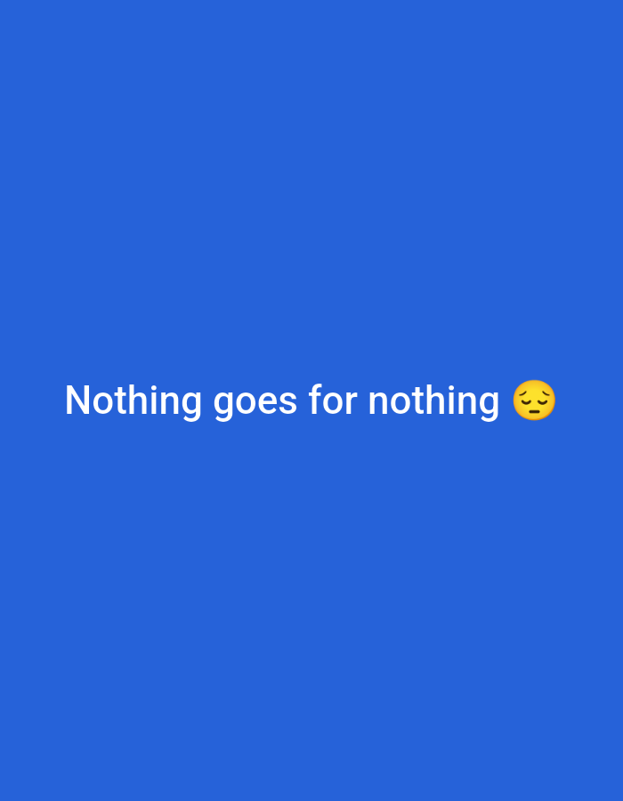 The image displays a digital graphic with a solid royal blue background. Centered horizontally on the screen, white text reads "Nothing goes for nothing." To the immediate right of the word "nothing" in the phrase, a yellow emoji depicts a sad or sleepy facial expression, characterized by downturned eyes and a slightly open mouth. There are no other subjects, objects, people, or actions visible. The environment depicted is solely this digital composition. The location is the city of Unknown, Unknown.