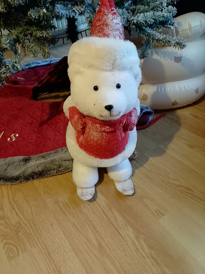 A white, plush teddy bear with a red hat and sweater stands on a wooden floor. A red Christmas tree skirt with gray trim partially surrounds the bear. A Christmas tree with white-tipped branches looms overhead. Behind the bear is an inflatable, white Christmas decoration featuring a bear pattern. The bear is centered, slightly off-balanced to the left of the frame.