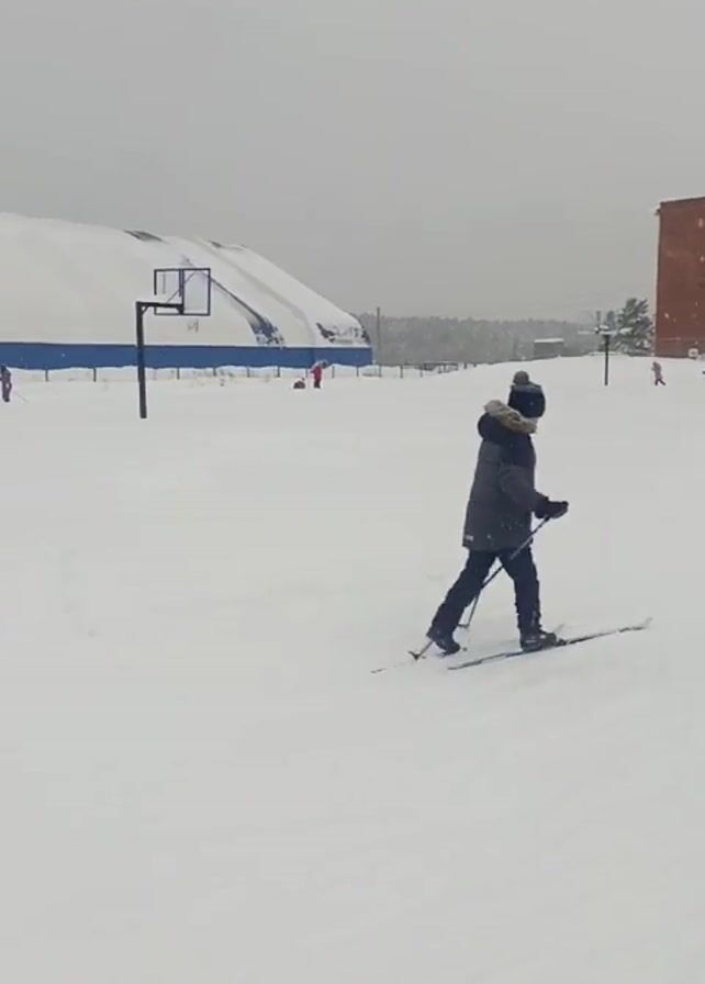 snowy outdoor scene with several people cross-country skiing. The weather appears overcast, and the ground is covered in a thick layer of snow. In the foreground, a person in a gray jacket and black pants is skiing. In the background, several other individuals, dressed in various colored winter clothing, are also skiing across the snowy field. A large, white-and-blue domed structure sits to the left. There are also a few bare soccer goals and a basketball hoop partly visible. In the far background, a red brick building and a treeline can be seen. One of the skiers in the foreground falls into the snow.