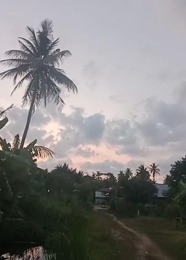 rural scene, likely at dusk or dawn given the soft lighting. A dirt path leads into the distance, flanked by lush vegetation, including tall grass, bushes, and various trees, notably coconut palms. The sky is overcast with clouds, showing hints of pink and orange from the setting or rising sun. A simple building or structure is partially visible in the background along the path. There are no people visible in the shot. The camera slowly pans across the scene.