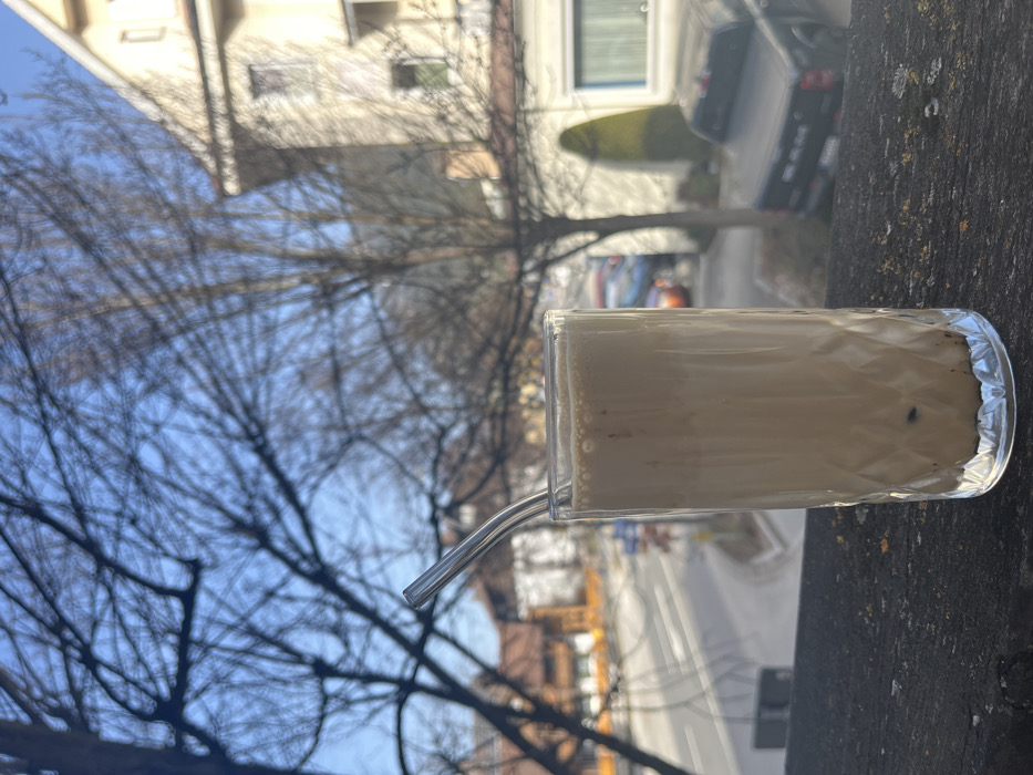 The image displays an outdoor scene from an elevated perspective, likely a balcony or terrace, overlooking a street in Garmisch-Partenkirchen, Germany. In the foreground, a clear, faceted glass tumbler containing a light brown, layered beverage is centered on a dark, textured railing or wall. The beverage shows a frothy top layer and darker sediment at the bottom. A silver-colored, bent metal straw is inserted into the drink. The midground reveals a paved street curving gently to the left, bordered by bare-branched deciduous trees and multi-story buildings. The architecture is consistent with traditional Bavarian styles, featuring gabled roofs and light-colored facades. A dark-colored pickup truck is parked on the right side of the road below. The background consists of a clear, bright blue sky. No individuals are visible. The scene is illuminated by natural sunlight, indicating daytime conditions, likely during late autumn, winter, or early spring due to the bare trees.