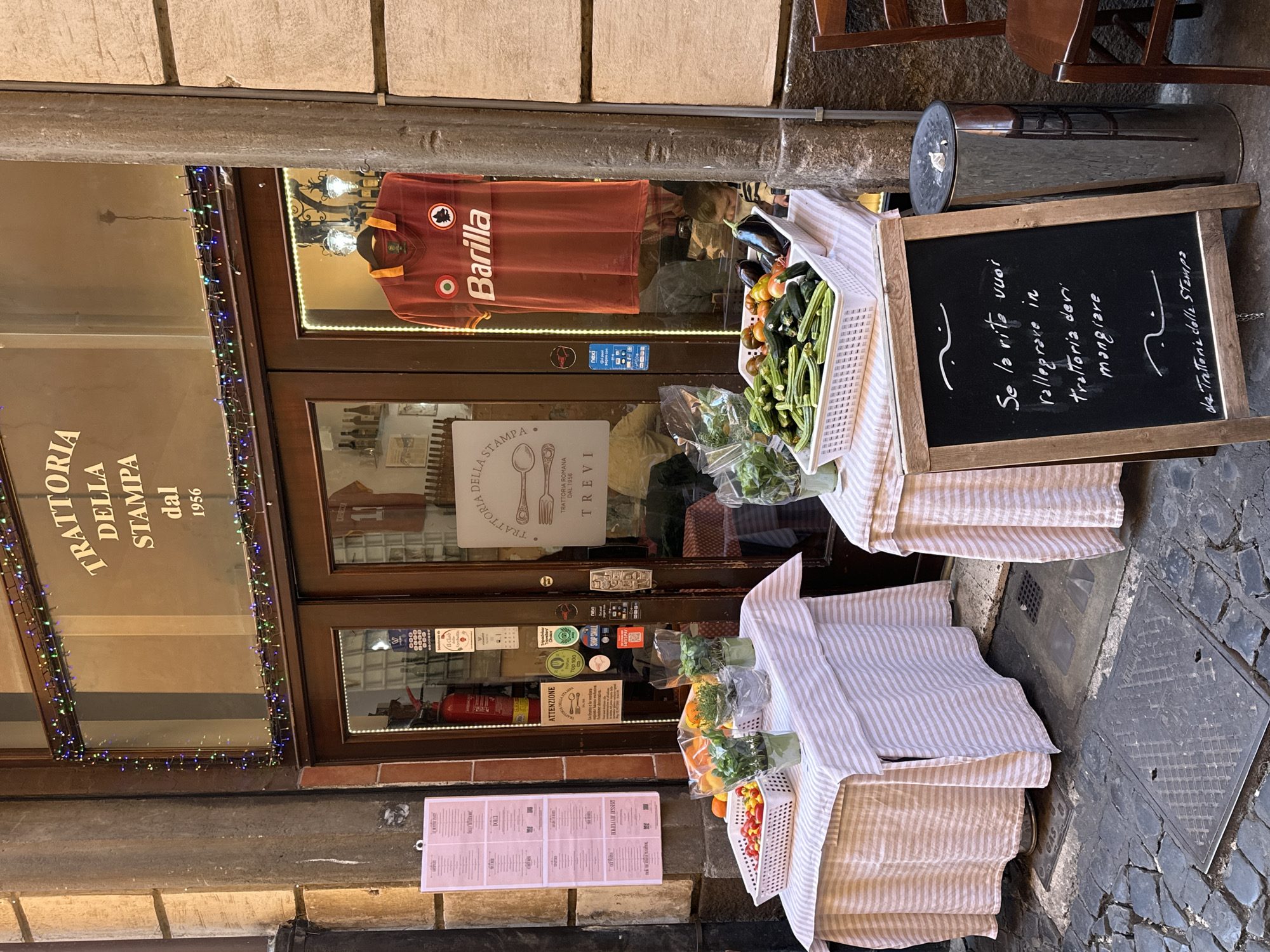 The image depicts the exterior of "TRATTORIA DELLA STAMPA dal 1956," located in the Trevi district of Rome, Italy, as indicated by signage. The trattoria's entrance consists of dark wooden double doors with glass panels, adorned with a string of colorful LED lights above. Inside the right door's window, a red AS Roma football jersey with the "Barilla" sponsor logo and team crests is displayed. The left door glass exhibits various stickers, including TripAdvisor and payment method logos, along with an "Attenzione" sign and a visible red fire extinguisher inside. Two rectangular tables, draped with light-colored striped tablecloths, are positioned directly in front of the entrance. The left table holds a white plastic basket containing small red and yellow tomatoes, alongside several potted herbs in clear plastic bags, and some oranges. The right table features two white plastic baskets; one filled with long green vegetables (possibly okra or small zucchini), and the other with a mix of eggplants, tomatoes, and possibly peppers. Additional potted herbs in plastic bags are also present on this table. To the left of the entrance, a laminated menu board with a pink background is affixed to a stone pillar. On the cobblestone street in front of the right table, a wooden A-frame chalkboard sign displays a handwritten message in white chalk: "Se la vita vuoi rallegrare in trattoria devi mangiare" (If you want to cheer up your life, you must eat in a trattoria), signed "La Trattoria della Stampa." Adjacent to the chalkboard is a cylindrical stainless steel trash can with crumpled paper visible at the top, and part of a dark wooden chair. The street itself is paved with dark grey cobblestones, and two metal utility covers are visible on the ground. No individuals are prominently featured in the foreground, but a blurry figure or reflection is discernable through the glass doors, inside the trattoria.