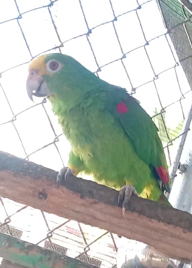 A person films a parrot perched inside of a cage. The parrot is green with red patches on the shoulders and some yellow on the head. The bird is standing on a wooden perch inside of a wire cage. The cage is open to the air, and the sun is shining behind it. The bird makes a brief, squawking sound.