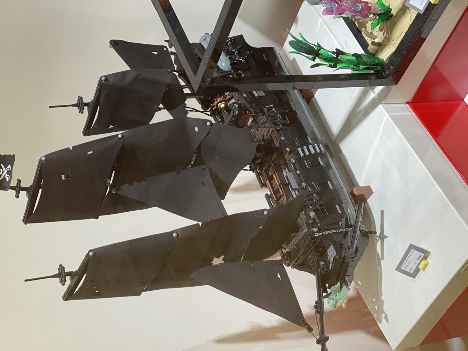 The scene depicts an indoor exhibition or retail display in Strasbourg, France. The primary subject is a large, intricately constructed LEGO model of a pirate ship, presented at a slight angle from above and to the port bow. The ship is predominantly black and features three masts rigged with multiple tattered, dark grey fabric sails. A black Jolly Roger flag, depicting a skull and crossed swords, flies from the mainmast. Deck details include a ship's wheel, various railings, and what appear to be cannons or gunports along the hull. A light green, possibly translucent, figurehead resembling a mythological creature is visible at the bowsprit. The LEGO ship rests on a white, rectangular display pedestal. A small white price tag is visible on the pedestal's surface, supported by yellow LEGO bricks. The tag reads "CAPTAIN JACK SPARROW'S PIRATE SHIP" and indicates a price of "€ 349.99." To the right of the ship display, a partial view of another exhibit is visible within a black-framed structure. This adjacent display contains LEGO models of green seaweed-like structures and pink/purple crystal-like coral formations, resting on a tan, sand-textured base. The background is a plain, light-colored wall. No people are visible in the image, and no active movement or interaction is depicted. A red surface is partially visible at the bottom right corner, suggesting another display component or base for the pedestals.