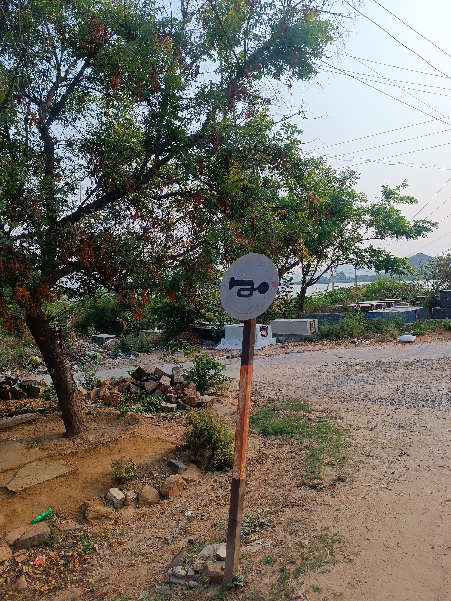"Sound Horn" road sign in Kothacheruvu, India. The sign is round, gray, and has a black horn symbol on it. The signpost is orange and gray, standing on a dirt ground with rocks and sparse vegetation. Behind the sign, there is a tree on the left and a road leading to a cemetery or burial ground with concrete structures, likely tombs or memorials. There is also a body of water and hills in the background under a hazy sky. There is garbage strewn around the area, particularly near the tree on the left. Overhead power lines are visible.