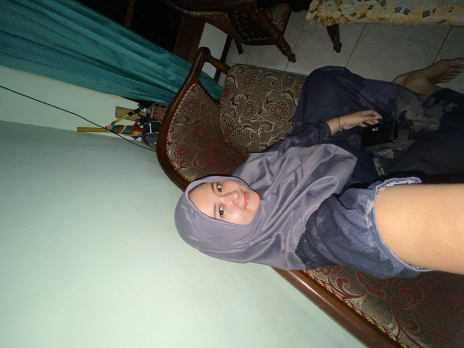 This image depicts an indoor domestic scene in Sumorame, Indonesia. A young adult female is seated on a sofa with ornate wooden arms and legs, upholstered in a patterned fabric featuring reddish-brown floral motifs on a darker background. She is wearing a grey hijab, a dark long-sleeved top with a subtle pattern, and dark trousers. A gold-toned bracelet is visible on her right wrist. Her right arm is extended towards the camera, and she holds a black smartphone in her left hand, which rests on her lap. She is looking directly at the camera with a slight smile. Her bare feet are visible on the light-colored tiled floor. The wall behind her is a light greenish-blue. To the right, a dark teal curtain is drawn, partially obscuring a window or doorway. A black electrical cord runs vertically along the wall, and various indistinguishable objects, including a colorful, striped item resembling an umbrella, are visible in the corner behind the sofa.