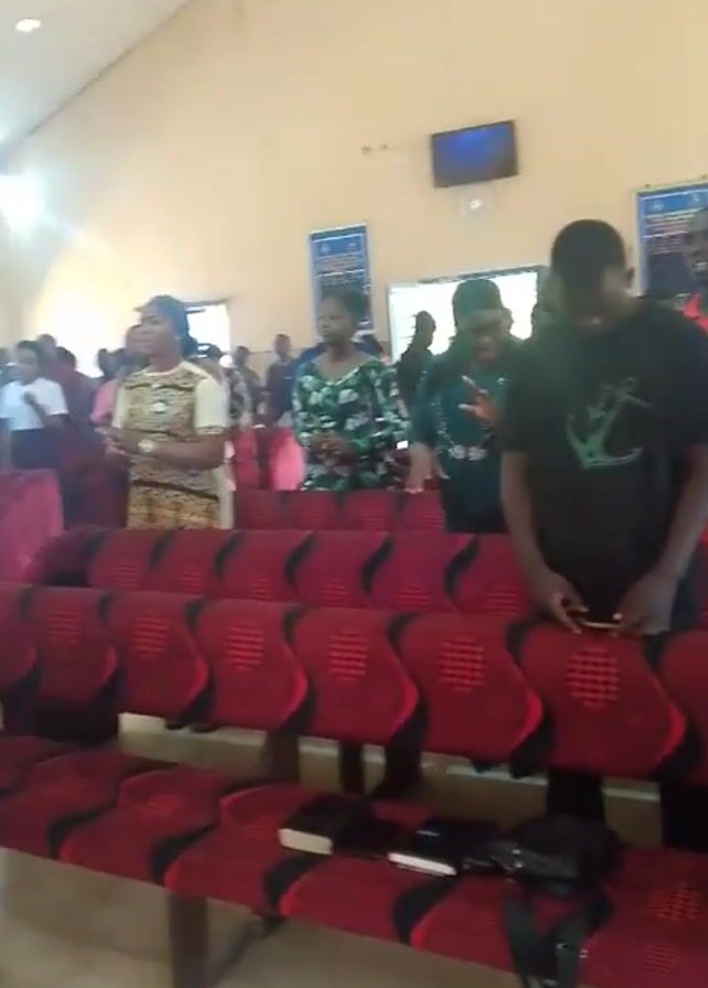 gathering of people in what appears to be a church or auditorium. They are standing and dancing to music, some are clapping. The room is lined with red upholstered seats. The space is illuminated with blue and white light fixtures. A few people are wearing formal attire. The environment seems festive and reverent.