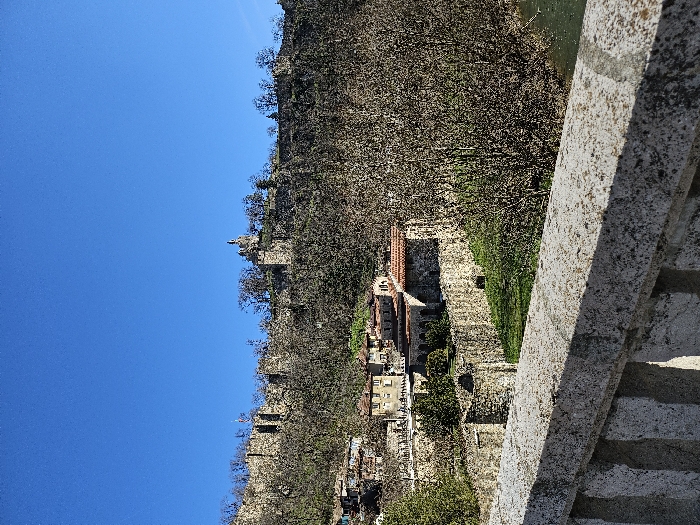 The image displays a panoramic view of the historic city of Veliko Tarnovo, Bulgaria, looking towards the Tsarevets Fortress and the surrounding urban landscape, likely from the Stambolov Bridge. In the foreground, a weathered, light gray concrete balustrade with visible vertical supports occupies the bottom portion of the frame, indicating the vantage point from a bridge or elevated structure. Immediately beyond the balustrade, a deep valley unfolds. On the left side of the midground, a cluster of traditional buildings with red-tiled roofs and stone facades are visible, situated on a terraced hillside supported by prominent stone retaining walls. Several small, indistinct human figures can be observed walking on a pathway or elevated platform among these structures. Green grass patches are interspersed between the buildings and walls. To the right in the midground, a dense grouping of bare deciduous trees with intricate branch networks stands alongside a body of water, identifiable as the Yantra River, whose green-tinged surface is partially visible at the far right. The background is dominated by a steep, tree-covered hill, largely populated by bare deciduous trees, suggesting a late winter or early spring season. Along the upper ridge of this hill, extensive stone fortress walls, characteristic of Tsarevets Fortress, stretch horizontally. At the highest point on the hilltop, a prominent architectural structure, featuring a domed roof and a spire, stands against the sky, identifiable as the Patriarchal Cathedral of the Holy Ascension of God, within the Tsarevets complex. The entire scene is set under a clear, vibrant blue sky. No explicit actions or interactions among the distant figures are discernible.