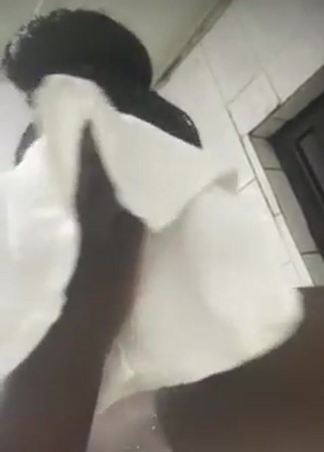 A woman is standing in a bathroom, looking at the camera and drying her face with a white towel. Her hair is pulled back in a bun. The bathroom has white tiled walls and a small window.