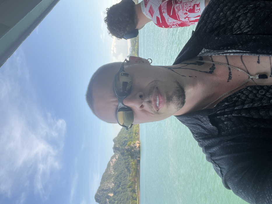 The image depicts two individuals on a vessel in a maritime environment near Don Sak, Thailand, during daytime under a clear blue sky with sparse clouds. In the foreground, a light-skinned male with a buzzed haircut and light facial hair is oriented towards the camera. He wears dark, reflective wrap-around sunglasses, an open dark collared shirt with a textured pattern, a silver chain with a dark rectangular pendant, and a silver hoop earring in his left ear. Dark tattoos, including abstract drips and script, are visible on his neck and chest. His lips are slightly parted. In the midground, to the right, the back of a second male individual is visible. He has dark, curly hair and wears dark over-ear headphones. He is clad in a white t-shirt with a red patterned design and is looking away from the camera, towards the right side of the frame. The background features an expansive body of calm, turquoise water. Beyond the water, several green-covered limestone karsts or islands rise. A dark structural element, consistent with part of a boat's canopy or deck, is visible in the upper right corner of the frame.