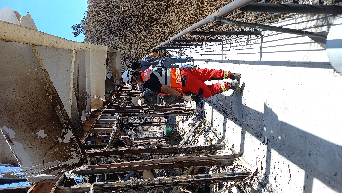 A rescuer in red pants and a safety vest carefully navigates the precarious remains of a burnt structure. The person is wearing a white helmet and is secured with a harness. Debris and charred materials litter the area. The sky is visible above the structure, suggesting an outdoor location, possibly a building or bridge. A railing runs alongside, casting shadows on the concrete surface.