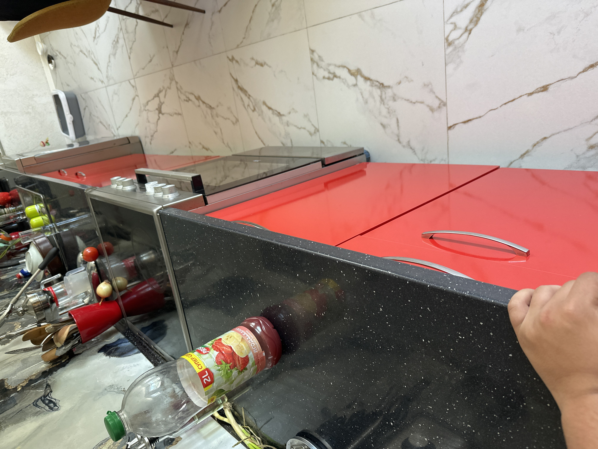 cluttered kitchen scene. The walls are covered with large, white marble-patterned tiles. There are several cooking appliances, some with metallic surfaces and black glass tops. Utensils and kitchenware are visible in a stainless-steel rack near the sink. A 2-liter bottle labeled "SUPER CP" lies on the dark countertop next to a container with red trim holding cooking utensils. The countertop is a dark, speckled material. To the right, there is a red cabinet with a silver handle. A person's hand and part of their arm are visible on the right edge of the image, seemingly touching the countertop. The specific location in Gulyantsi, Bulgaria cannot be determined from the visual information provided.