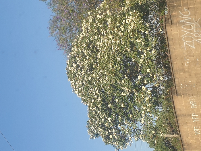 This image depicts an outdoor, daytime scene in Jos, Nigeria, characterized by flora and a perimeter wall under a clear blue sky. A large tree with dense green foliage and numerous white blossoms, consistent with Plumeria or Frangipani, occupies the central and upper-mid portions of the frame. To the upper right, a portion of another tree with sparser green leaves and purple flowers is visible. A light brown, mortared concrete block wall runs horizontally across the lower third of the image. Strung along the top of this wall is coiled razor wire, serving as a security feature. Graffiti is visible on the wall's surface: on the left, the words "VOTE YPP PART" are spray-painted in white, referring to the Youth Progressive Party. On the right, also in white spray paint, are the words "ZOYONG AREPS." The environment suggests an urban or suburban setting, with the wall likely belonging to a private property or institution. No individuals are visible in the scene.