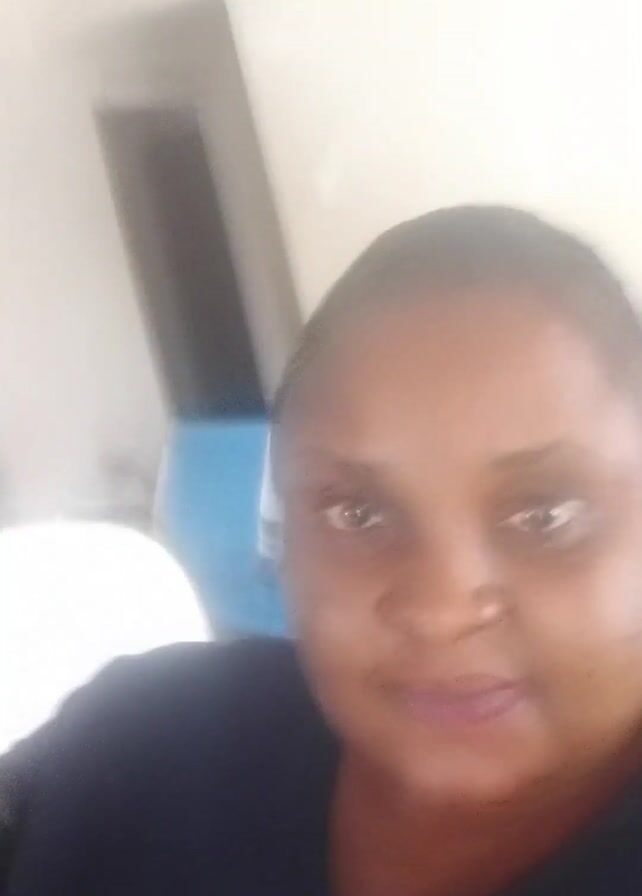 A woman wearing a dark blue shirt holds a stethoscope in her left hand in front of her face. She then raises the stethoscope over her head. The woman appears to be in an indoor space with white walls. Behind her, there is a partially visible row of blue seats and a doorway.