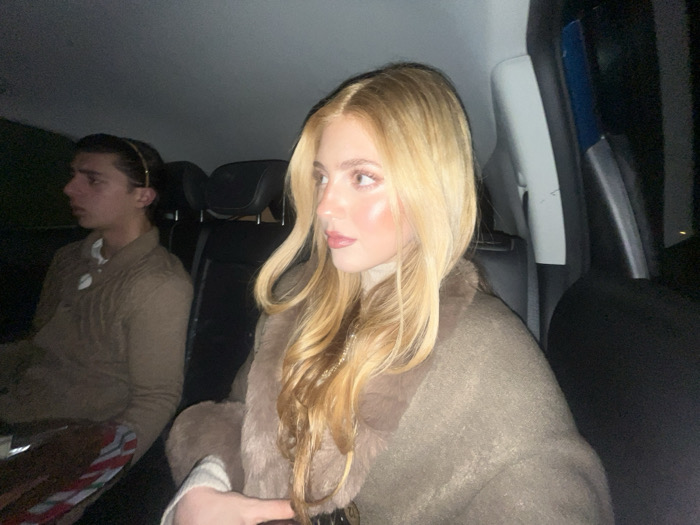 Inside a car, a blonde woman in a fur-trimmed coat looks to her left. Her hair is styled in waves. Seated next to her is a man in a brown sweater, wearing a headband. He is looking forward. The car's interior is dark, with the headrests and seatbacks visible. A section of the car door is also within view.