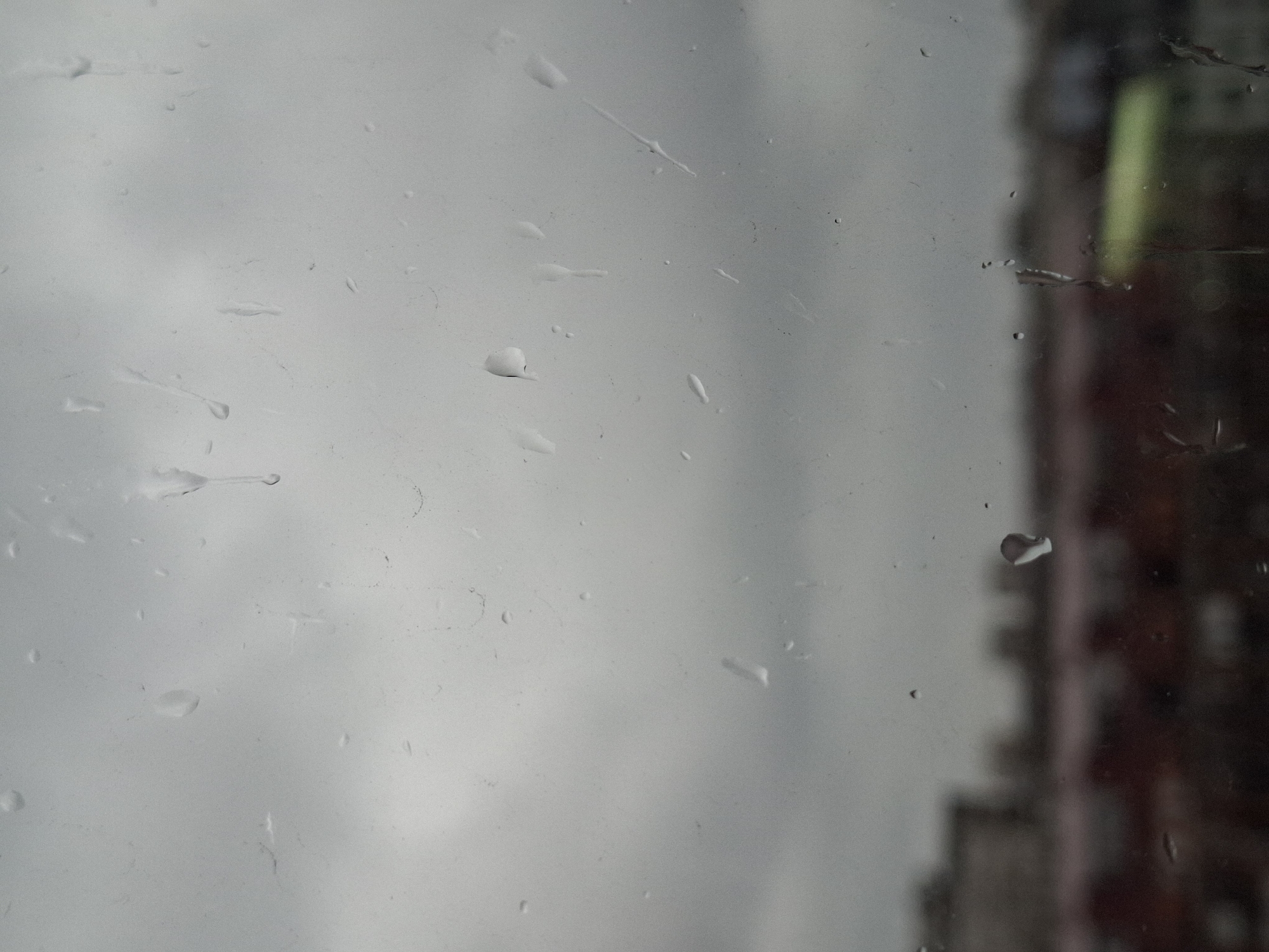view through a window covered in raindrops