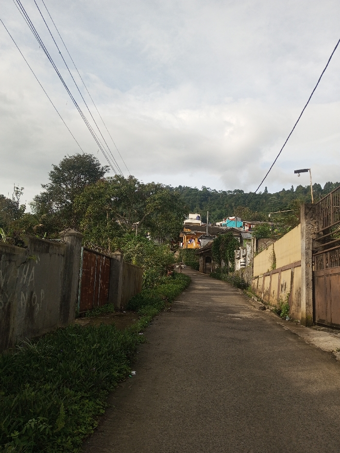 A narrow asphalt road winds uphill, flanked by walls on either side. Lush greenery creeps along the base of the walls. Beyond the walls, glimpses of houses and foliage dot the hillside. Utility wires crisscross the sky above. Overcast skies and subdued lighting create a tranquil atmosphere in this residential area.