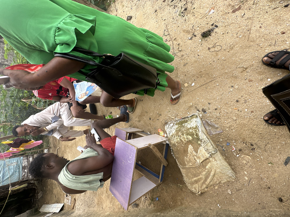 The scene captures an outdoor gathering of five individuals on a sandy dirt surface in Iriebe, Nigeria