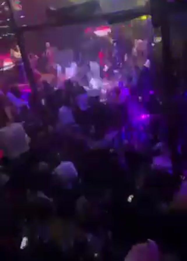A crowded club is shown with patrons dancing and holding up phones. Bright green, red, and blue lights shine from above. The video appears to be taken from behind a clear barrier.