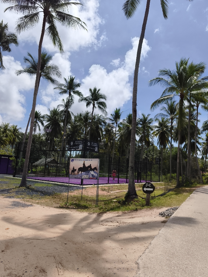 A sunny outdoor scene showcases palm trees against a sky with scattered clouds. A purple tennis court is visible behind a sign for the "COCO SAMUI RIDING CLUB," featuring silhouettes of horse riders. A sign with an arrow pointing left and a crab logo stands near a paved path. Shadows from the palm trees stretch across the sandy ground in the foreground. A person wearing red clothing can be seen in the tennis court.