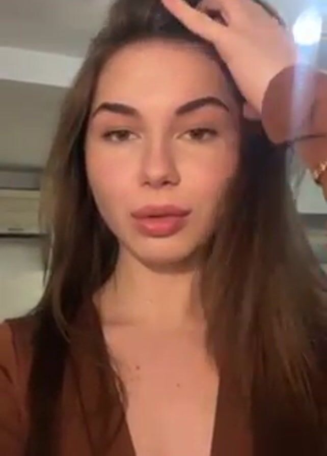 A young woman with long brown hair and a brown top is looking directly at the camera. She runs her hand through her hair, tucking it behind her ear. The background shows parts of a room, potentially a kitchen area. Music is playing in the background.