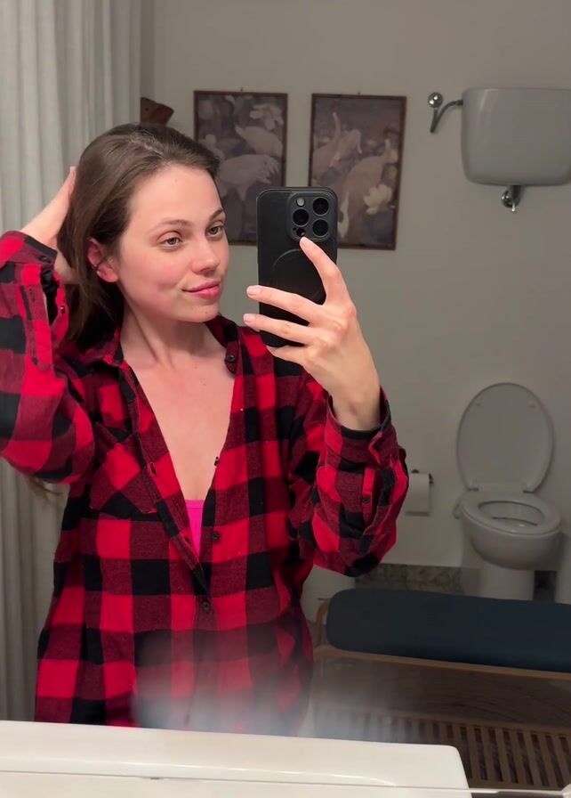 A woman stands in a bathroom and takes a selfie with a black cell phone. She wears a red and black flannel shirt over a pink top. She is touching her brown hair with her right hand. Behind her is a white sink and mirror. To the right are two framed pictures, a white toilet with the lid up, and a blue cushioned bench. A white shower curtain hangs to the left of the mirror.