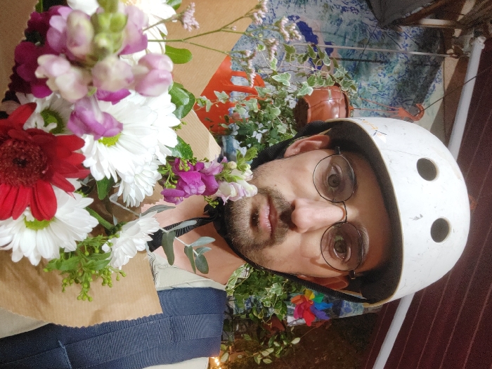 A male individual is depicted in a medium close-up, looking directly at the camera. He wears a white, scuffed protective helmet with two circular ventilation holes on top and a black chin strap. Round-framed eyeglasses are worn, and he has short facial hair. A prominent bouquet of flowers is held in the foreground, wrapped in brown kraft paper. The bouquet includes white chrysanthemums, a red gerbera daisy, and purple and pink snapdragons, mixed with green foliage. The individual wears a light-colored upper garment, and a dark blue strap, consistent with a backpack, is visible over his right shoulder. The background features a faded blue and white patterned wall or surface, dense green foliage, a terracotta-colored hanging plant pot, and a small, rainbow-colored decorative item. A dark reddish-brown ceiling or awning is visible at the top right. The scene is located in Tel Aviv, Israel.
