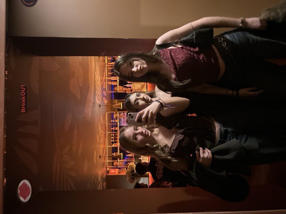 The image displays a mirror selfie featuring three young women inside the Breakout Bar, located at Av