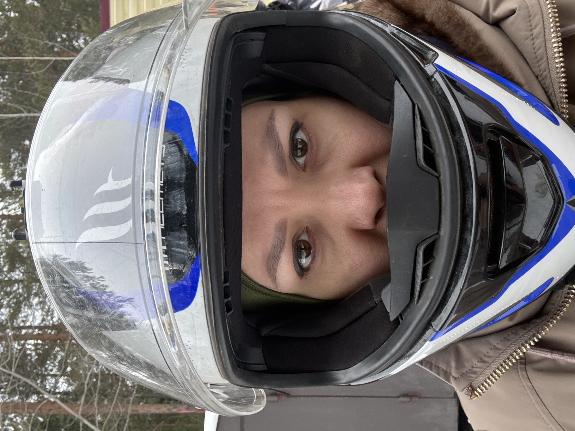 A close-up, rotated, eye-level shot reveals a woman wearing a helmet. The helmet is white with blue and silver accents. She is also wearing a jacket, partially visible at the bottom of the frame. Bare trees and a building exterior are visible in the blurred background. The location is Izluchinsk, Russia.