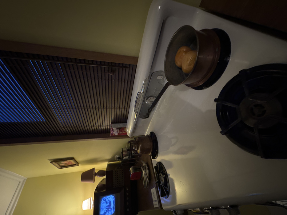 A vintage white stove stands in a room with yellow walls. A small, brown pot containing two yellow objects sits on a burner. Blinds cover the window above the stove, and a box of 40 Band-Aids is on the window ledge. A retro television set and a small lamp sit on a table. A framed picture hangs on the wall.