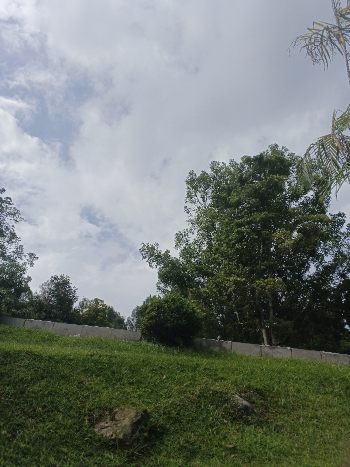 The image displays an outdoor scene in Baglung, Nepal, characterized by a sloping terrain under a partly cloudy sky. The foreground is dominated by a vivid green grassy slope. A dark, irregularly shaped rock is partially embedded in the grass in the lower-left quadrant. Horizontally traversing the mid-ground is a low, unadorned concrete retaining wall. Behind this wall, a dense line of various trees and shrubs, displaying shades of green foliage, forms the background. A prominent, large tree with extensive dark green leaves stands on the right side, immediately behind the retaining wall. In the upper-right corner, several withered fronds of a palm-like tree are visible, extending partially out of frame. The sky occupies the upper portion of the image, featuring a mix of white and light grey clouds interspersed with areas of lighter blue sky. No individuals, animals, or specific actions or interactions are depicted within the scene.