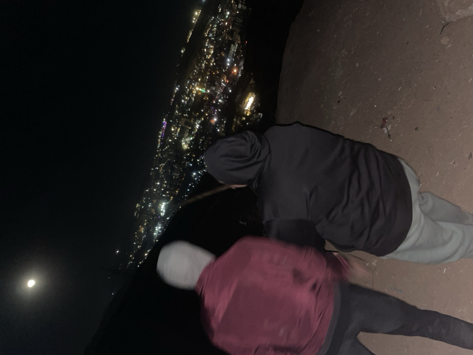 The scene depicts a nighttime panorama from an elevated, unpaved vantage point within Dummar Municipality, Syria. Two individuals are observed from behind in the foreground, facing towards a sprawling illuminated city below. The person on the left exhibits significant motion blur, wearing a light-colored hooded garment and a dark red jacket over dark trousers. The person on the right is less blurred, attired in a black hooded sweatshirt and light-colored pants, holding a thin, dark, stick-like object angled downwards. The immediate ground consists of barren, reddish-brown soil with minimal scattered debris, including a small red item near the right subject's feet. In the dark sky, a bright moon is prominently visible above the cityscape. The urban area below is densely populated with artificial lights, predominantly white and yellow, extending across the landscape and into the distance, with some distinct colored lights also present.