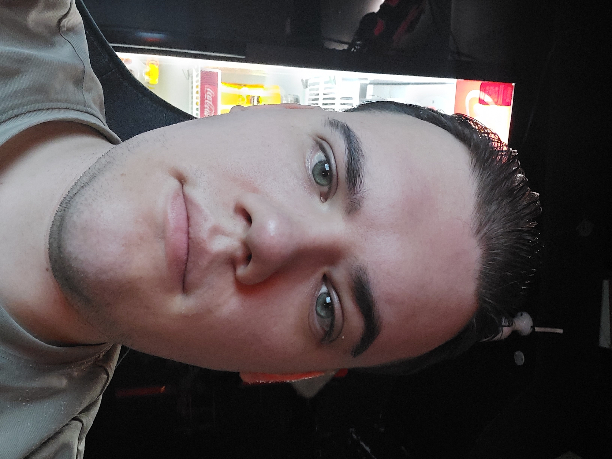 A close-up selfie of a fair-skinned male with short dark hair and green eyes