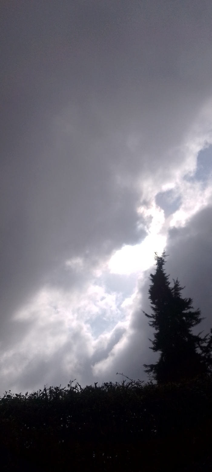 The scene, located in Ngong ward, Kenya, depicts an outdoor environment dominated by a cloudy sky. The upper and left portions of the frame are covered by dark grey, dense clouds. Towards the center-right, a significant break in the cloud cover reveals brighter white clouds and patches of light blue sky. A tall, dark coniferous tree is prominently silhouetted on the right side of the image, extending upwards from the lower right corner and partially obscuring the bright cloud break. A horizontal band of dark, dense foliage or a hedge is silhouetted across the bottom fifth of the frame. No individuals, animals, actions, or man-made structures are visible.