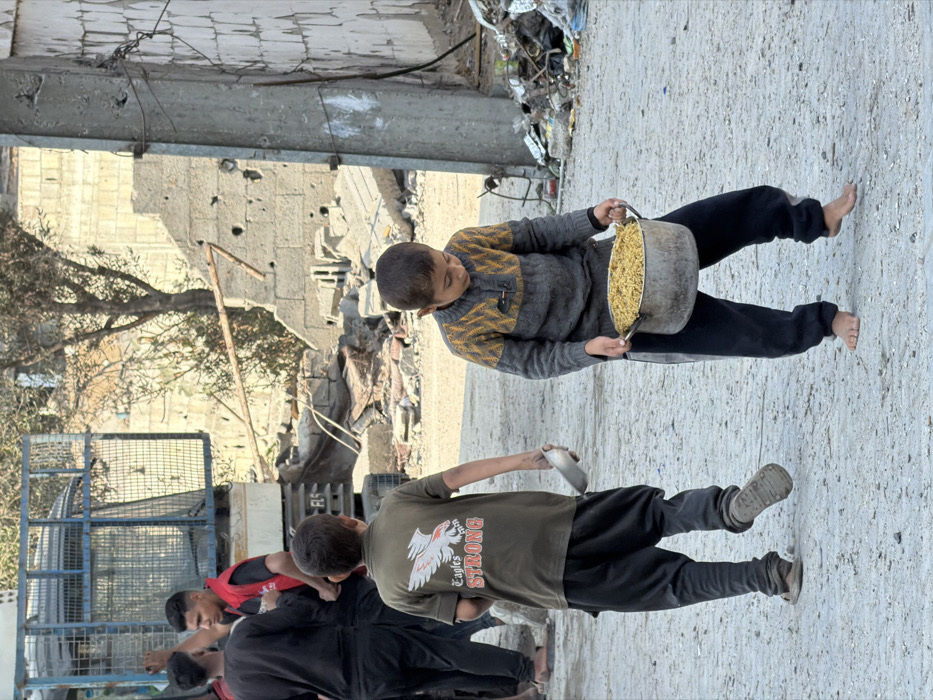 A young boy barefoot is carrying a pot full of food and wearing a gray and yellow sweater and black pants. Behind him is another boy wearing a t-shirt with an eagle that says "Strong" and black pants with a shoe on one foot and none on the other. Behind them is a group of people and a partially destroyed building, and trash can be seen.